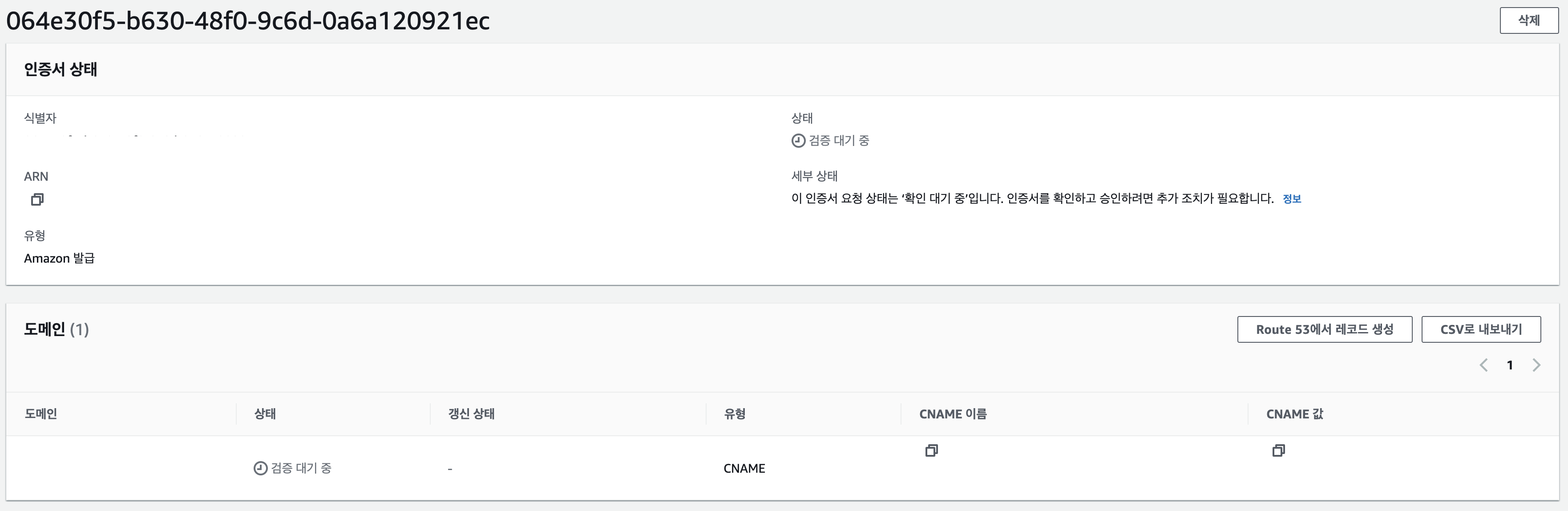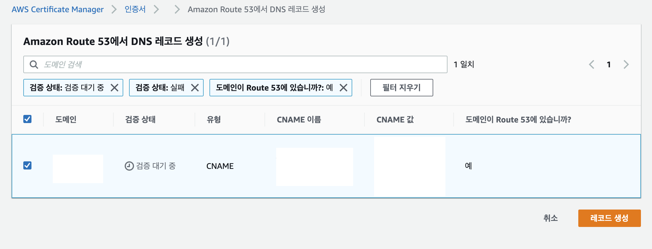 AWS에서 도메인을 구입한 경우, AWS 로 도메인을 이전한 경우는 레코드 생성 버튼을 누르면 Route53 에 자동으로 CNAME 이름과 값이 등록되어 인증이 완료된다.