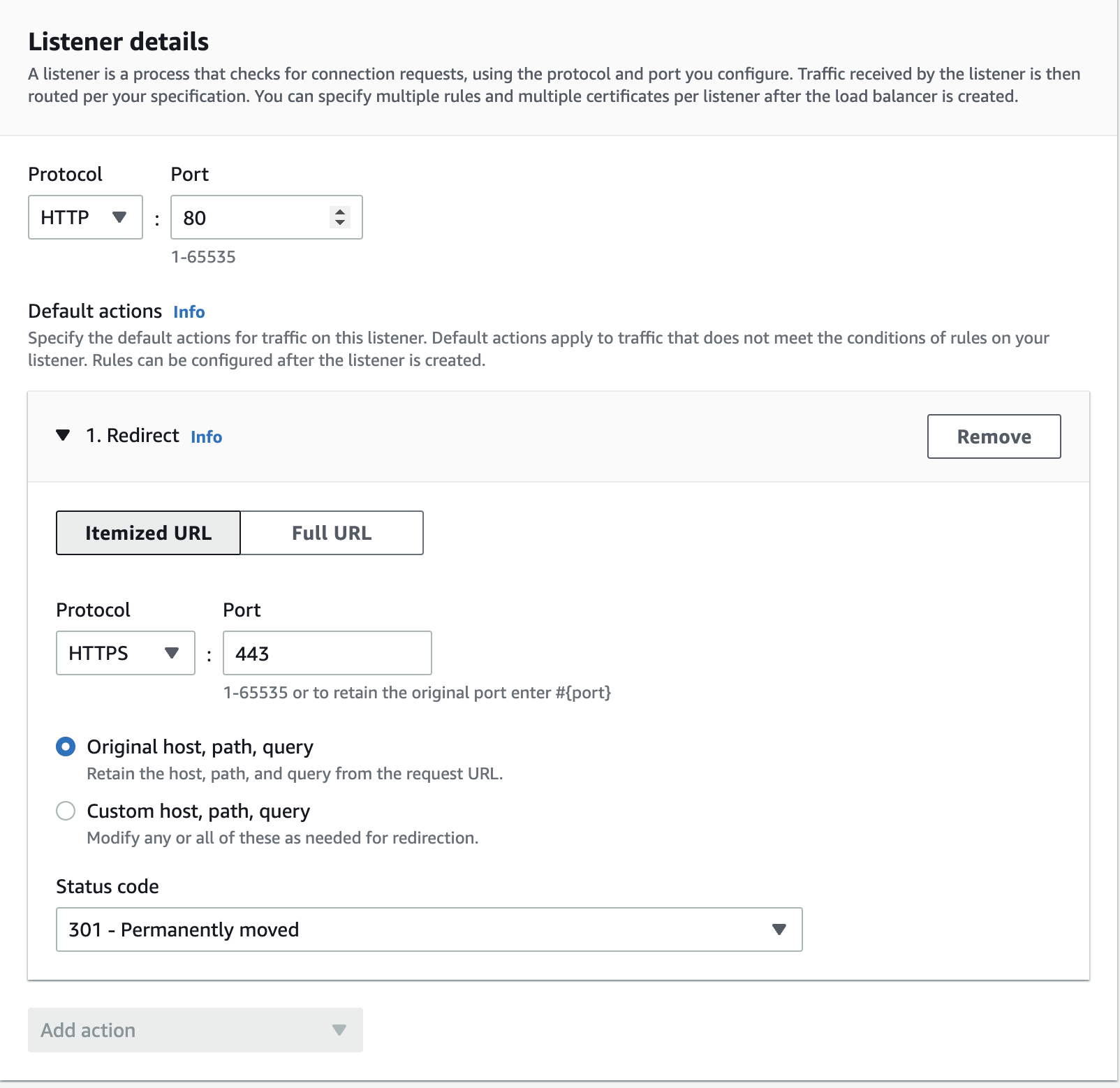 80번 포트로 들어오는 연결을 담당하는 리스너의 설정을 변경하여 https (443번 포트)로 리다이렉션 하도록 한다.
