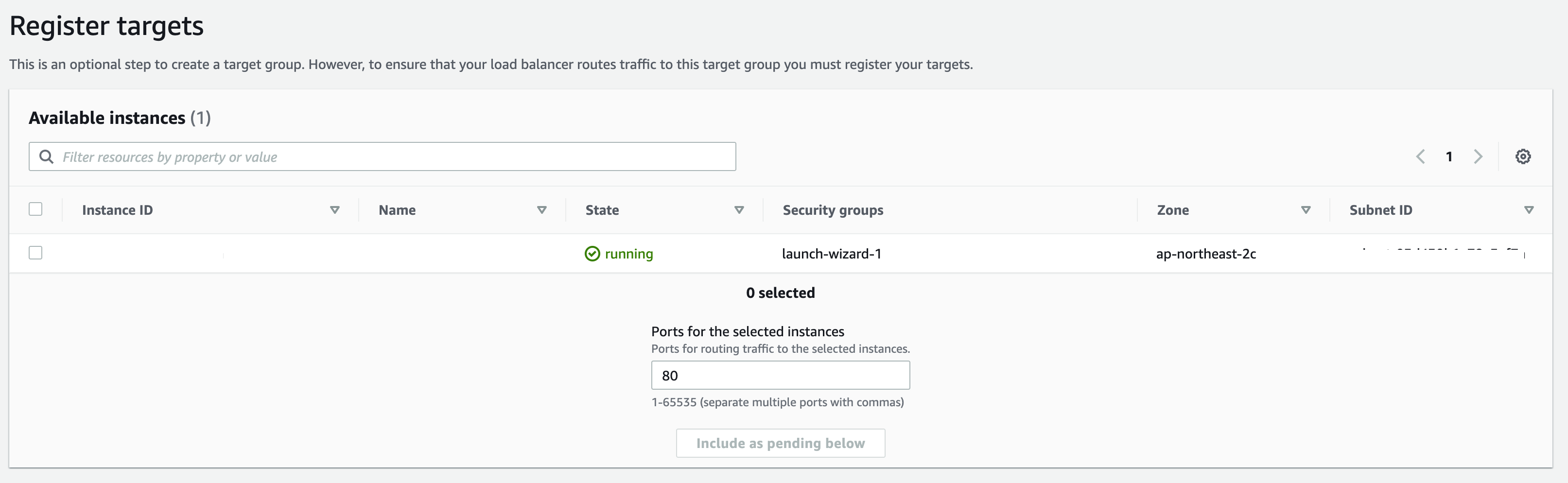 생성한 인스턴스 선택, 포트는 80번으로 설정