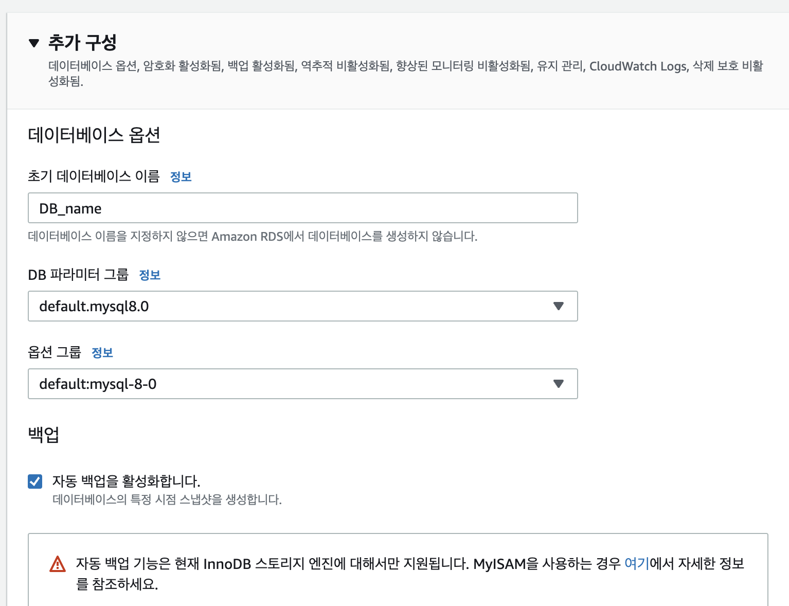 저는 로컬 컴퓨터에서 Mysql 워크벤치로 RDS에 접근할 것이라 퍼블릭 엑세스를 허용했습니다.