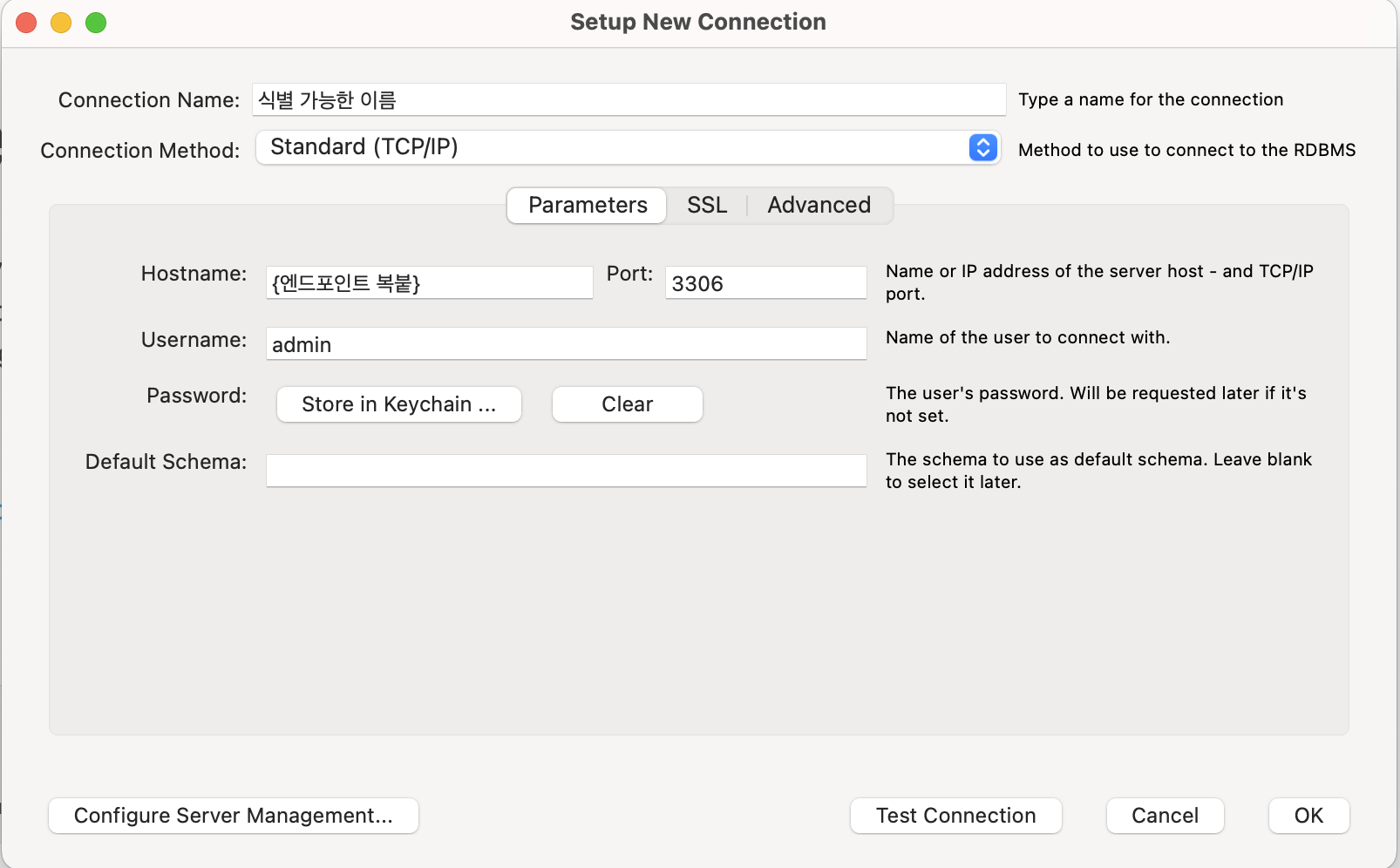 - Hostname은 RDS의 엔드포인트를 입력합니다.
