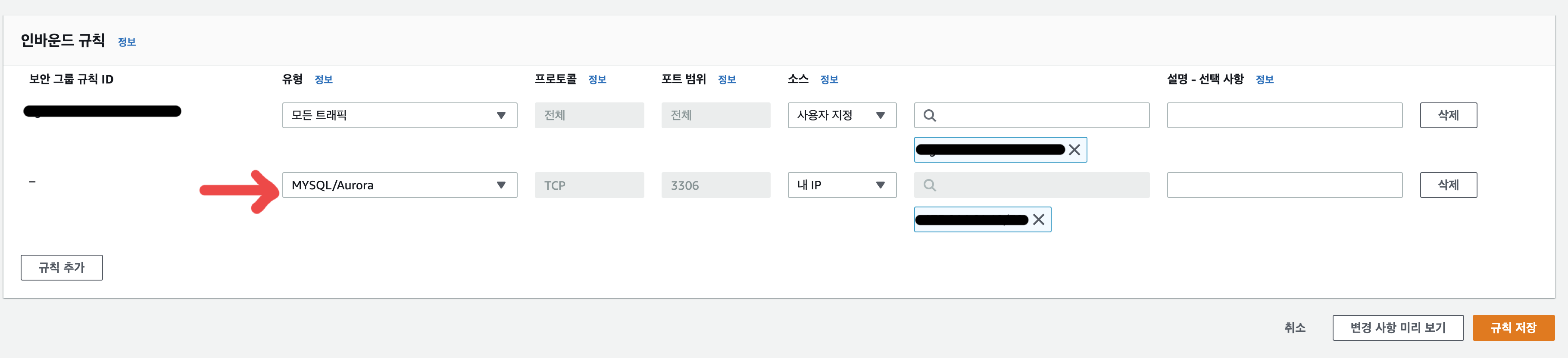 인바운드 규칙 편집을 눌렀으면, Mysql/Aurora 타입을 선택하고, 소스 탭에서 내 IP를 선택합니다.