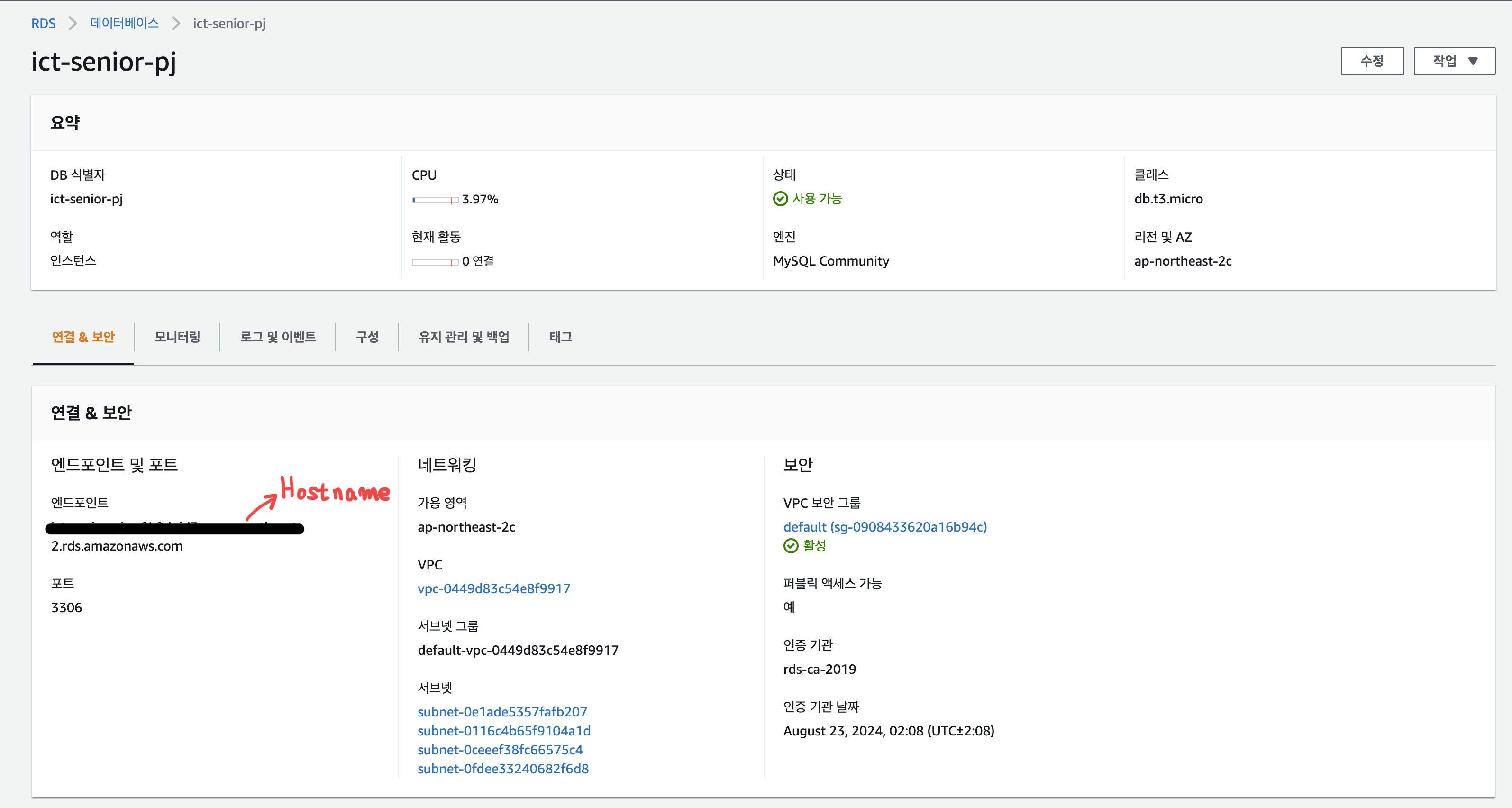 - Hostname은 RDS의 엔드포인트를 입력합니다.
