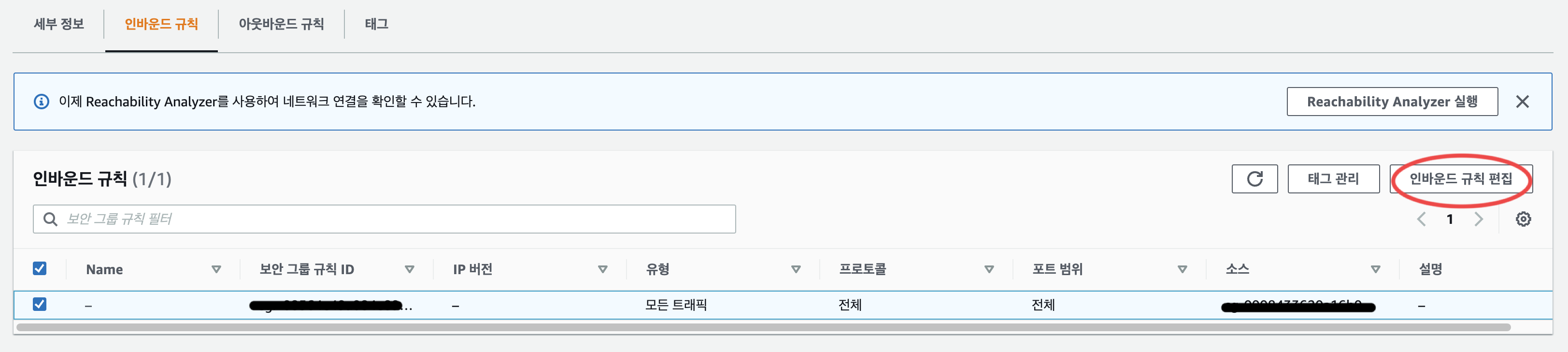 보안을 위해 모든 트래픽을 허용해주는 기본 설정은 삭제해줍니다. (삭제 안 해도 연결하는데 지장은 없습니다.)